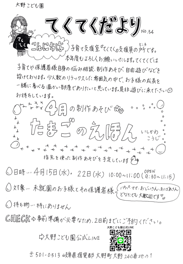 4月の支援室は絵本「たまごのえほん いしか わこうじ 作」を題材に、指先を使った制作あそびをします。ご予約やお問い合わせはこちら「大野こども園公式LINE」にて受付してます。